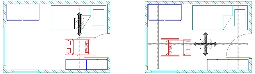 Vanuit de goedkoopst adequate denkwijze kies je automatisch voor het linker railstraject. Een enkele rail, dwars over het bed, altijd het goedkoopst. Maar ook echt adequaat? Voor het juist positioneren van de gebruiker in de rolstoel, moet de rolstoel wel precies recht onder de rail staan. Maar hoe gemakkelijk kun je een electrische rolstoel van de gebruiker precies op die exacte positie manouvreren en ook nog genoeg verzorgings- en transferruimte overhouden? Is het rechter railstraject niet een beter alternatief waarbij een 3e bewegende plafondrails jou moet volgen in plaats van andersom. Hier kun je overal in de ruimte een transfer beginnen en kan de kamerindeling in de toekomst nog prima veranderen zoals bijvoorbeeld tieners dat graag doen.