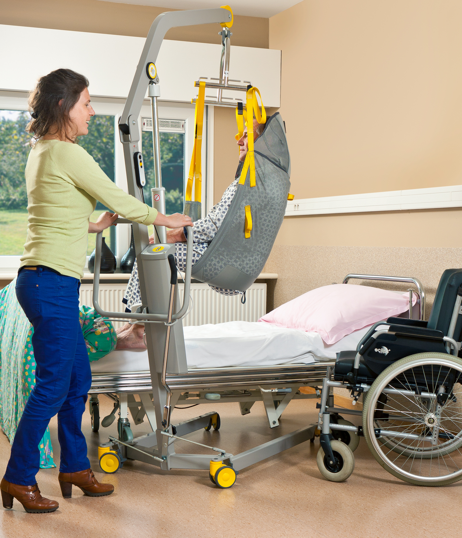 Dankzij de brede spreiding van de ophangpunten biedt dit tiljuk een stabiele en natuurlijke zithouding – prettig voor de gebruiker, én ergonomisch verantwoord voor de verzorger. De extra hoofdruimte geeft bovendien een ontspannen gevoel tijdens de transfer.