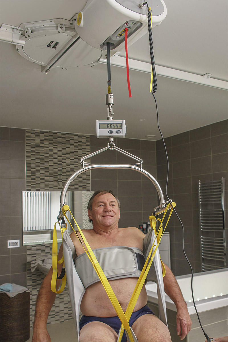 De weegunit wordt geplaatst tussen het draaioog van het tilsysteem en de tilbeugel of het tiljuk. Je kiest zelf of je de weegschaal permanent laat hangen of enkel tijdelijk gebruikt. Dit maakt de weegschaal ideaal voor gebruik op meerdere afdelingen of in verschillende leefgroepen.