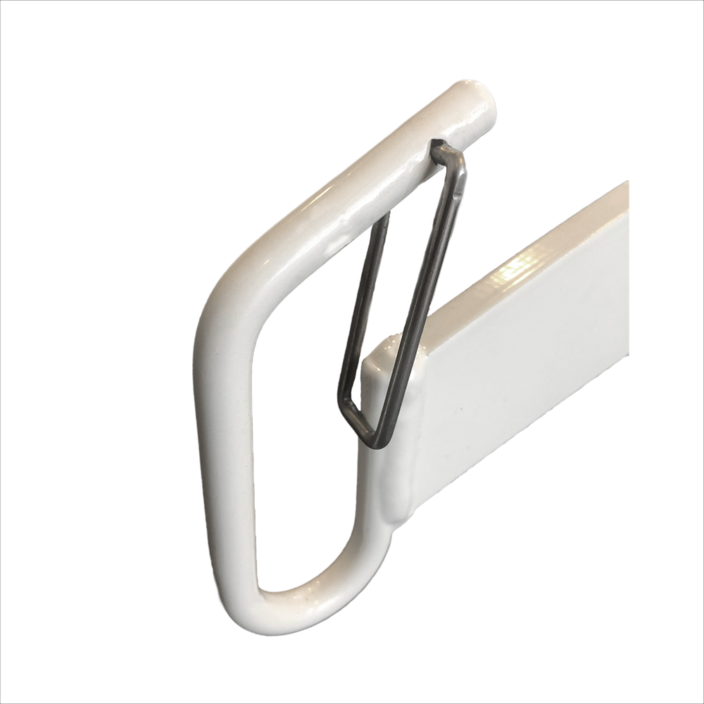 Het hijsjuk is vervaardigd uit staal en voorzien van een coating in een neutrale witte kleurstelling. Dit zorgt voor een rustige uitstraling en maakt het product eenvoudig te reinigen.