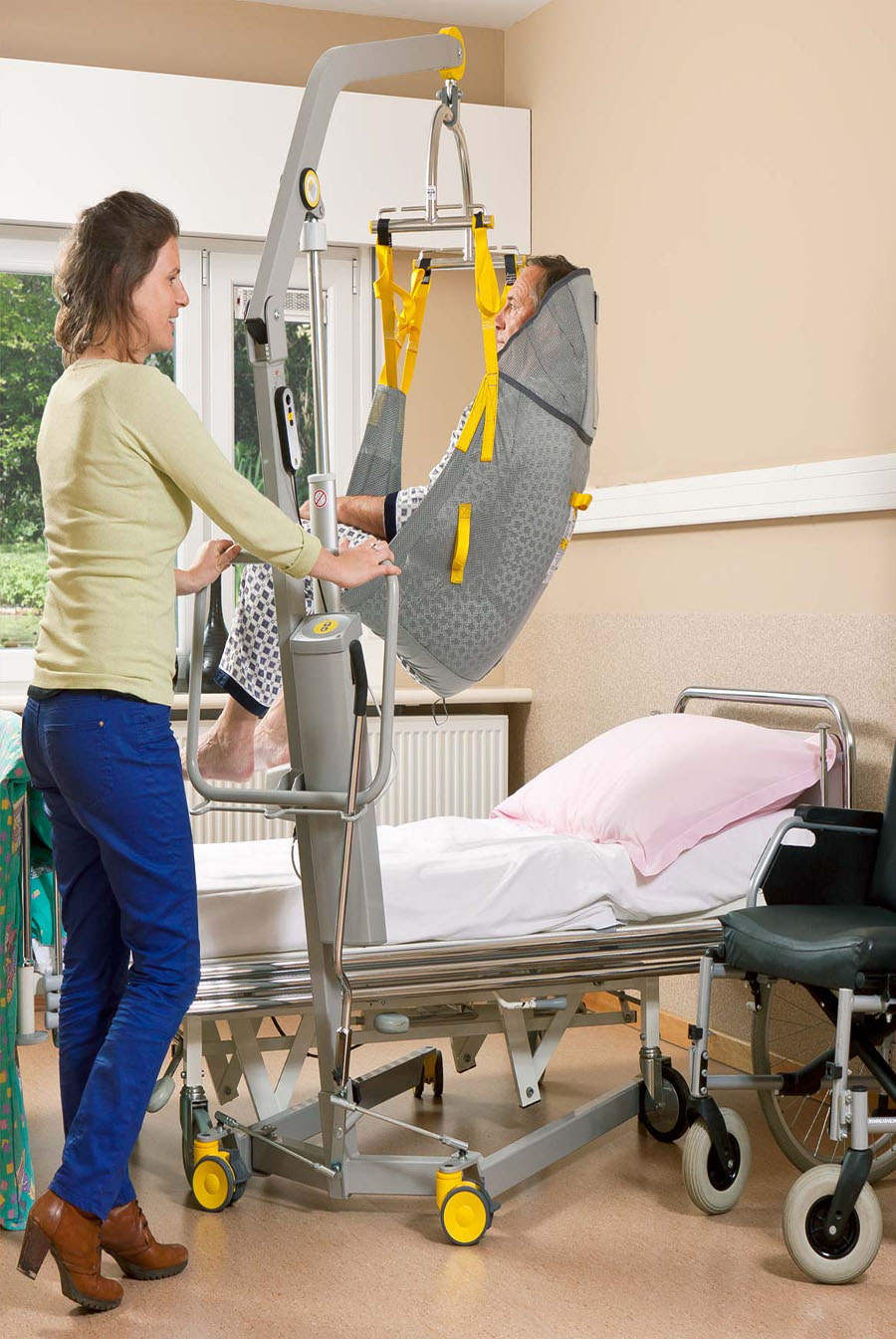Tillen met de Maxi verrijdbare tillift met een tilband of Surehands tilbeugel.