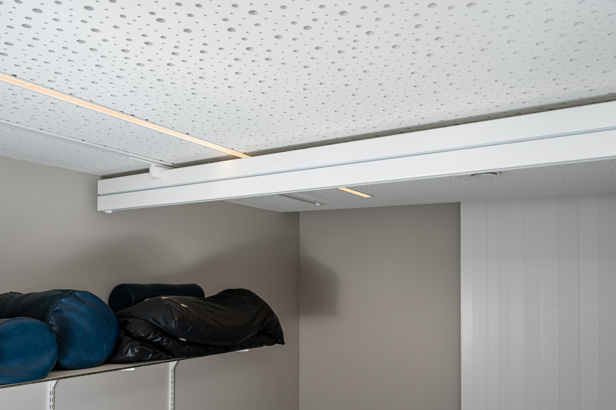 Voor elk ophangpunt zorgen we voor een dubbele, veilige bevestiging. De rails kunnen worden gemonteerd aan het plafond, van muur tot muur, of geïntegreerd in een (systeem)plafond. Bij klassieke montage worden stevige plafondbeugels om de 120 cm geplaatst – ook toepasbaar bij verlaagde plafonds.