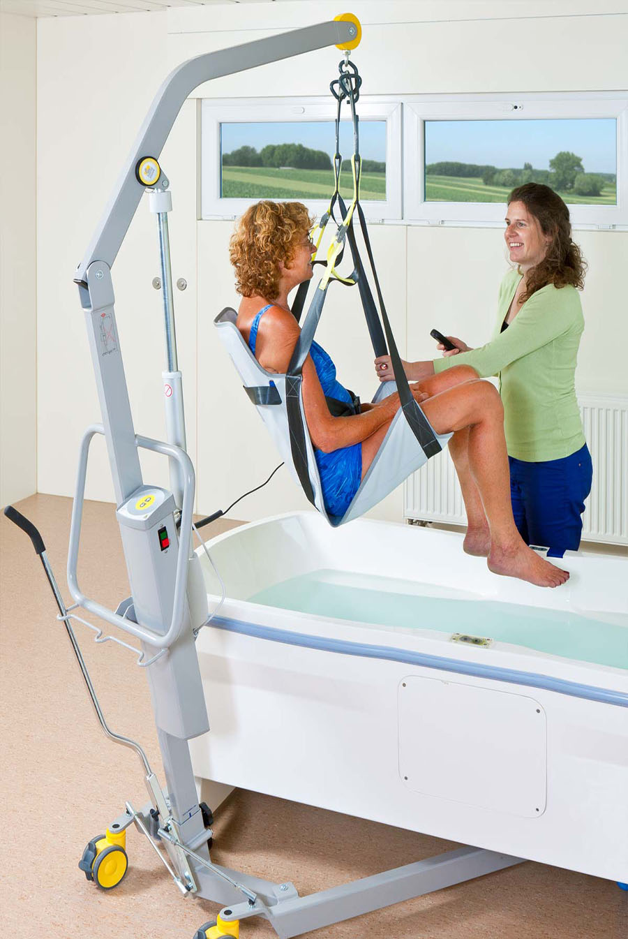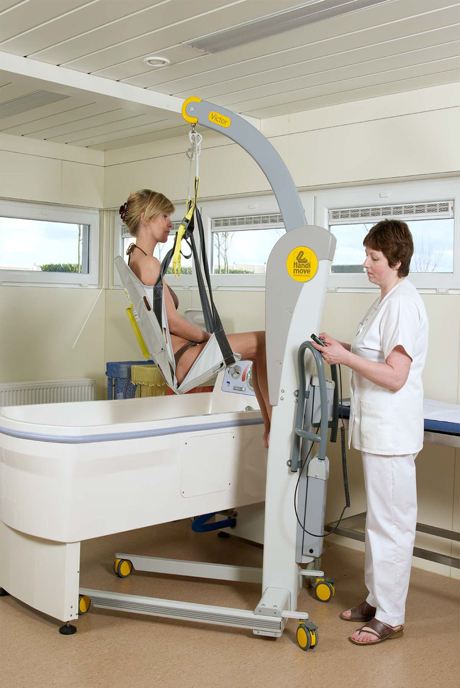 Je neemt makkelijk plaats, net als op een gewone stoel. De tillift doet vervolgens het werk. Het stoeltje past op alle Handi-Move tilliften en is in verschillende posities verstelbaar voor de juiste ondersteuning en een fijne zithouding. Na gebruik spoel je het simpel af, droogt het snel en kun je het makkelijk opbergen.
